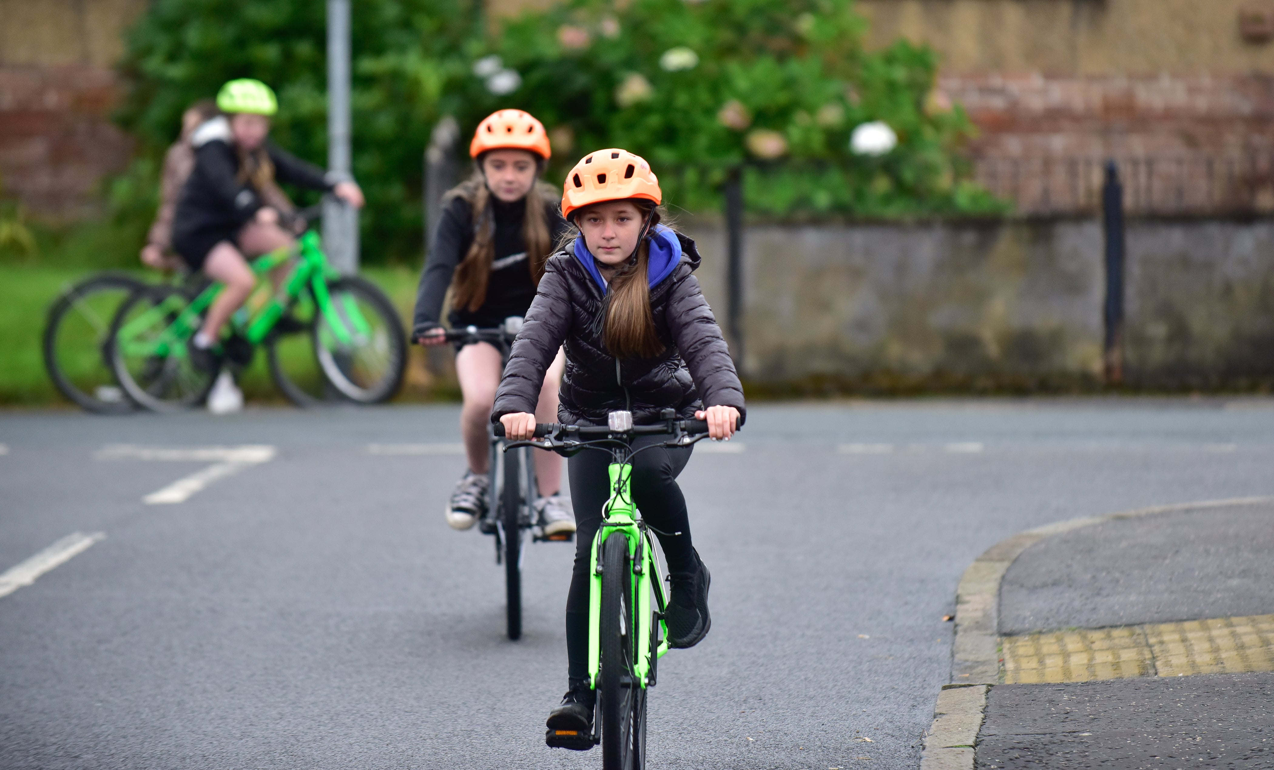 People cycling on Goosecroft Road in the centre of Stirling, part of the city's newly completed 'Walk, Cycle, Live Stirling' network of protected cycle lanes